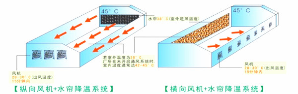 水簾降溫是通過水蒸發(fā)降溫:水簾運(yùn)行時(shí)通過風(fēng)機(jī)的協(xié)助,使外界高溫的熱空氣通過水簾時(shí),使水蒸發(fā)一部分,使水變成水蒸氣帶走部分熱量,啟到降溫效。