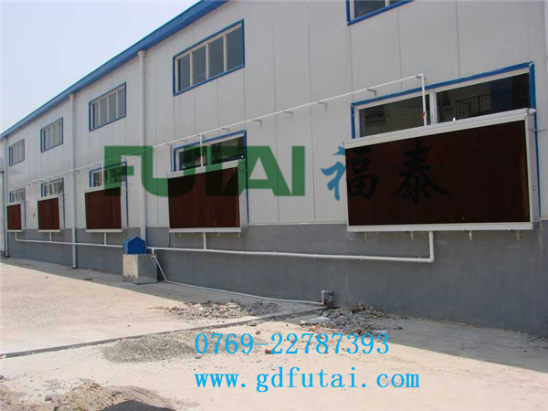 “福泰”濕簾降溫是通過蒸發(fā)降溫的一種經(jīng)濟(jì)的降溫方式。干熱空氣通過水簾進(jìn)入室內(nèi),由于水簾內(nèi)孔壁均勻布滿水膜,這樣室外新鮮空氣穿過水簾時(shí),水簾上的水會(huì)吸收空氣中的熱量并產(chǎn)生蒸發(fā)現(xiàn)象,使新鮮空氣溫度下降,濕度增加,完成降溫過程,從而使廠房里的空氣變得涼爽、濕潤(rùn)。負(fù)壓風(fēng)機(jī)通過自動(dòng)控制系統(tǒng)實(shí)現(xiàn)風(fēng)機(jī)百葉的自動(dòng)開啟和關(guān)閉達(dá)到防塵、防水、美觀的效果。噪音低、風(fēng)量大、耗電少、降溫效果明顯;既可吹風(fēng)、也可抽風(fēng),質(zhì)量保證!是廠房等降溫通風(fēng)的最佳選擇。